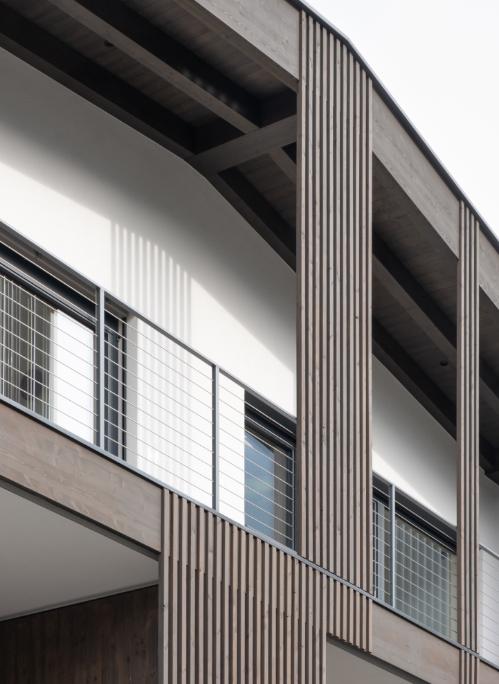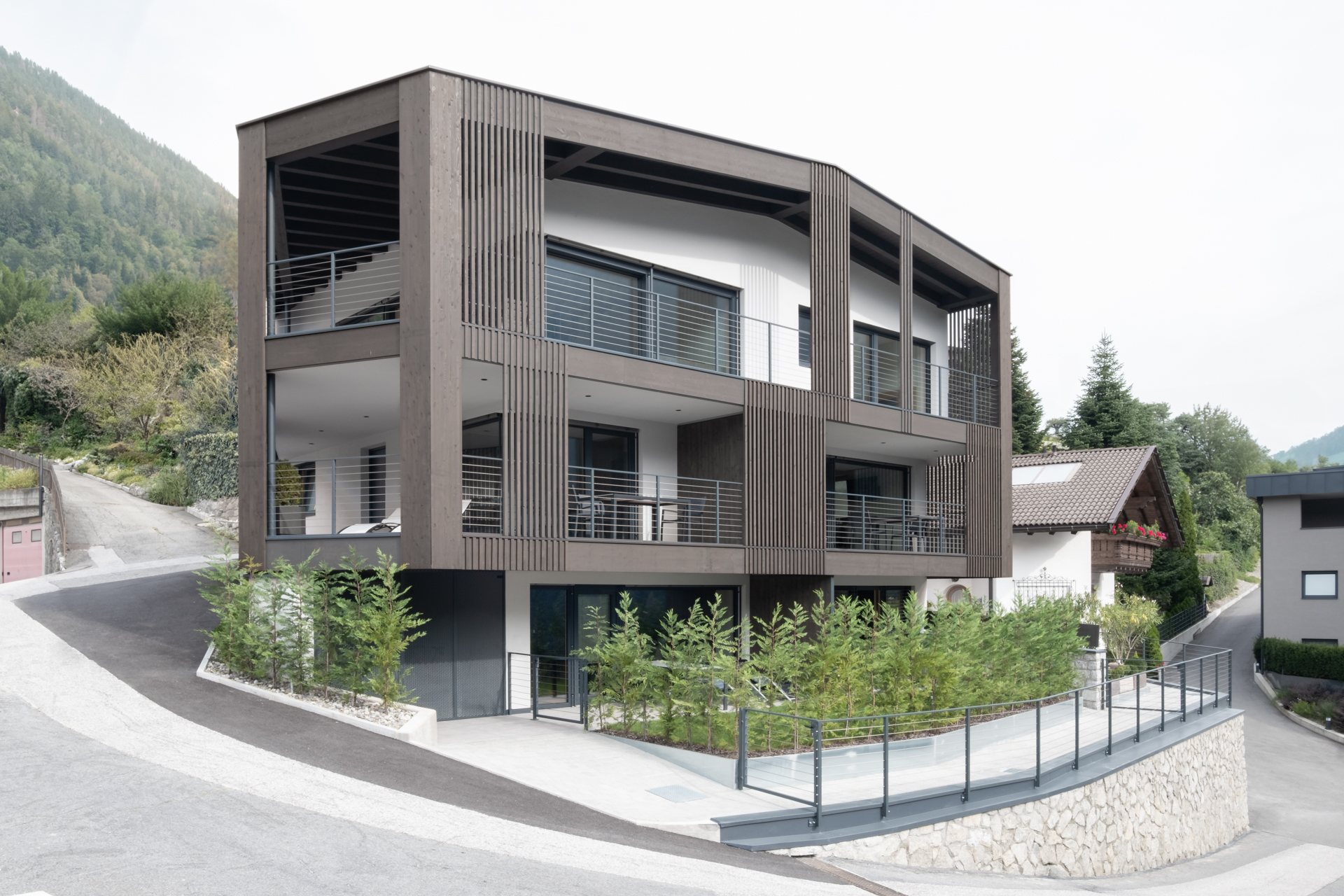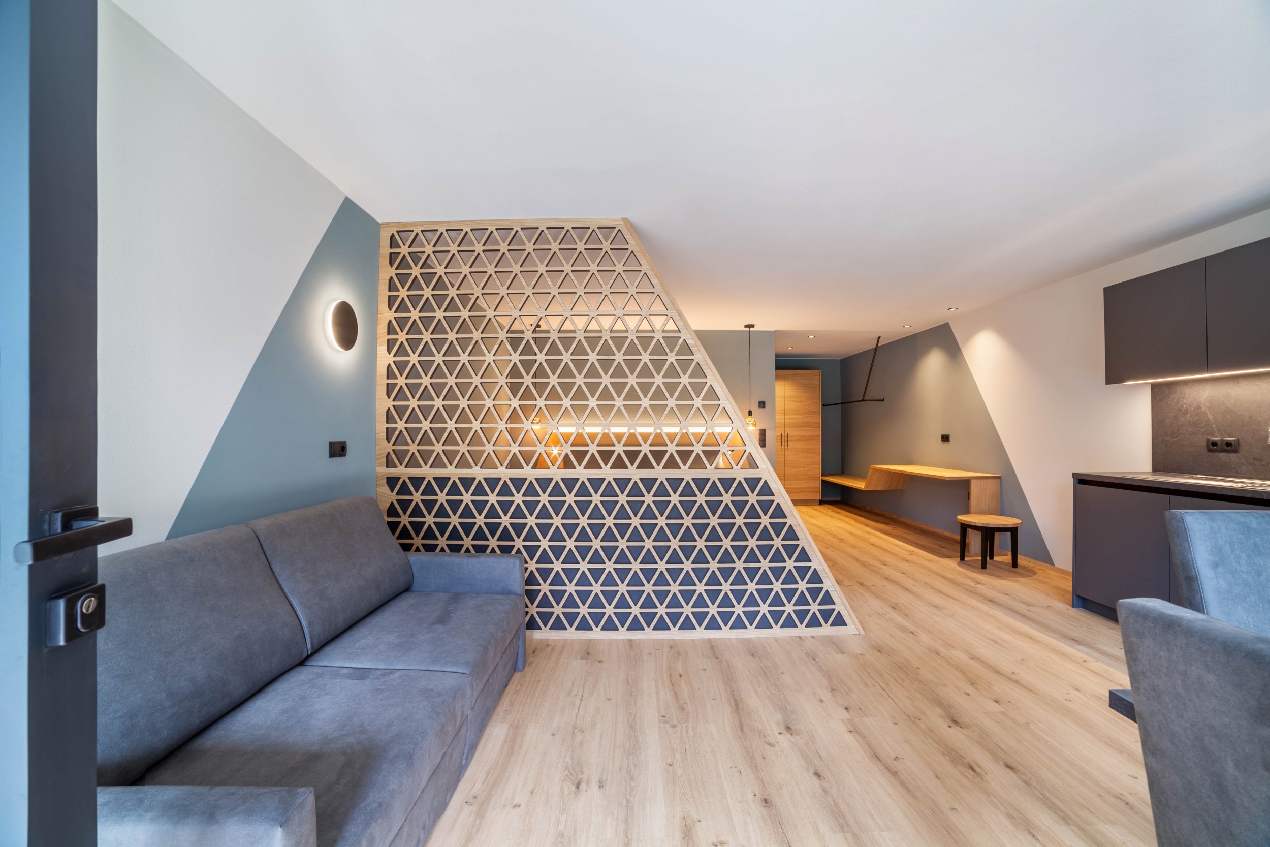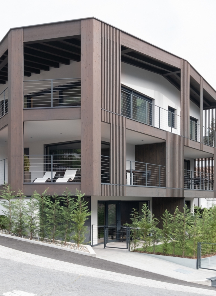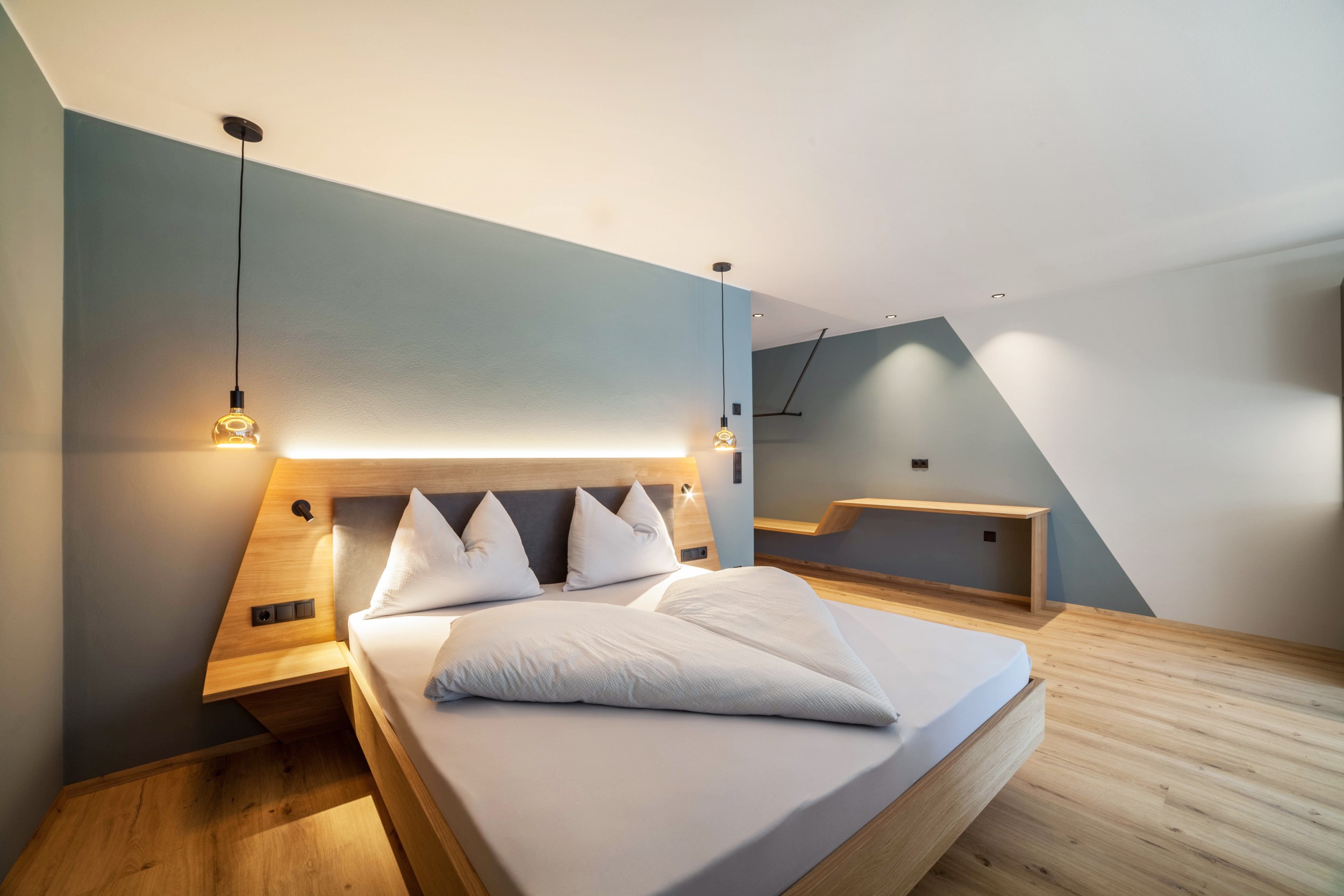 Aus Alt wird Neu. Ein klassisches Bestandsgebäude wird mit einem Neubau ersetzt. Das Gebäude mit 4 Ferienwohnungen und einer Privatwohnung peppt das Saltauser Dorfzentrum auf. Schräge Kanten integrieren die Form ins umlaufende Straßennetz. Schräg wird auch der Leitsatz für den Innenraum. Wände, Wandfliesen, Möbel werden mit Diagonalen versetzt.