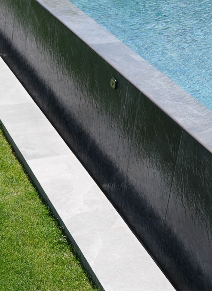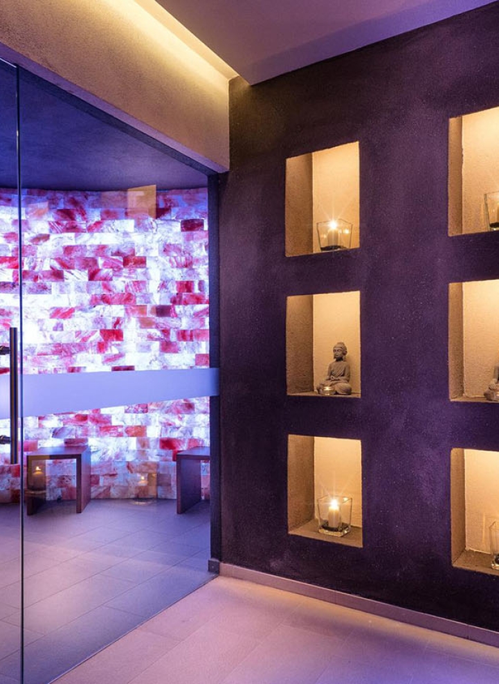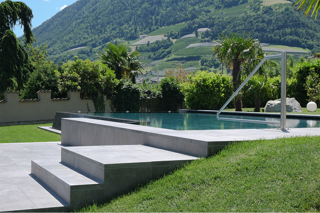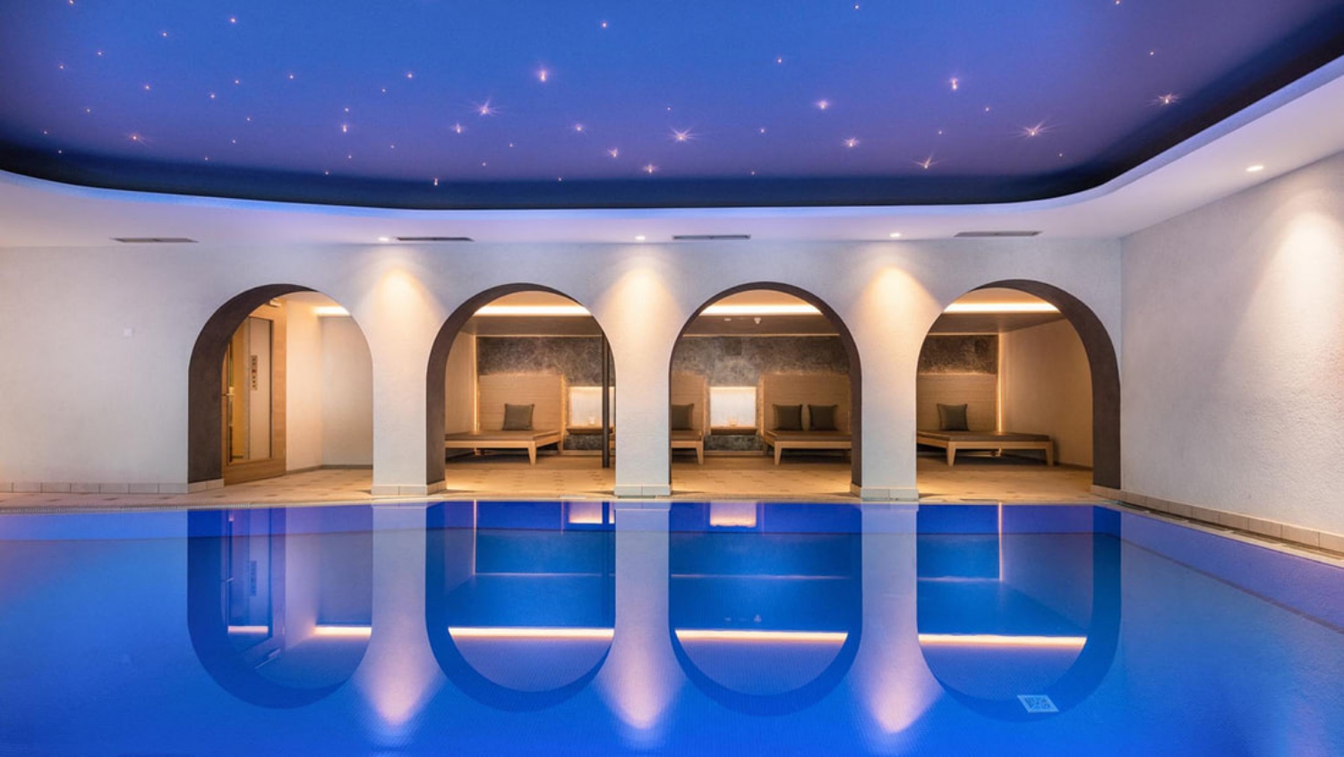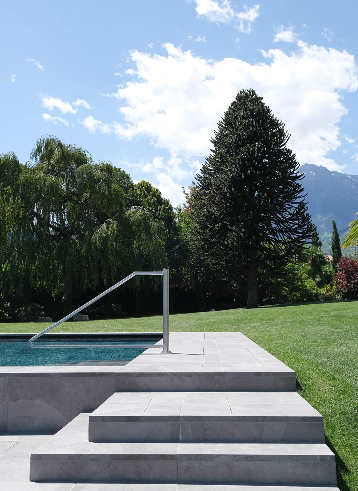 Die kleine und feine Oase, umringt von Apfelwiesen, liegt selbst in einem traumhaften Garten. Es muss ein bisschen glitzern! Eine durchgehende Designsprache, mit ein bisschen Klitzer und Klemmer, war der Anspruch der Bauherrschaft, dem es galt gerecht zu werden. Im Jahr 2019 wurde der Außenpool errichtet, im Frühling 2024 die Loungeerweiterung mit der neuen Eingangsfassade in Betrieb genommen.