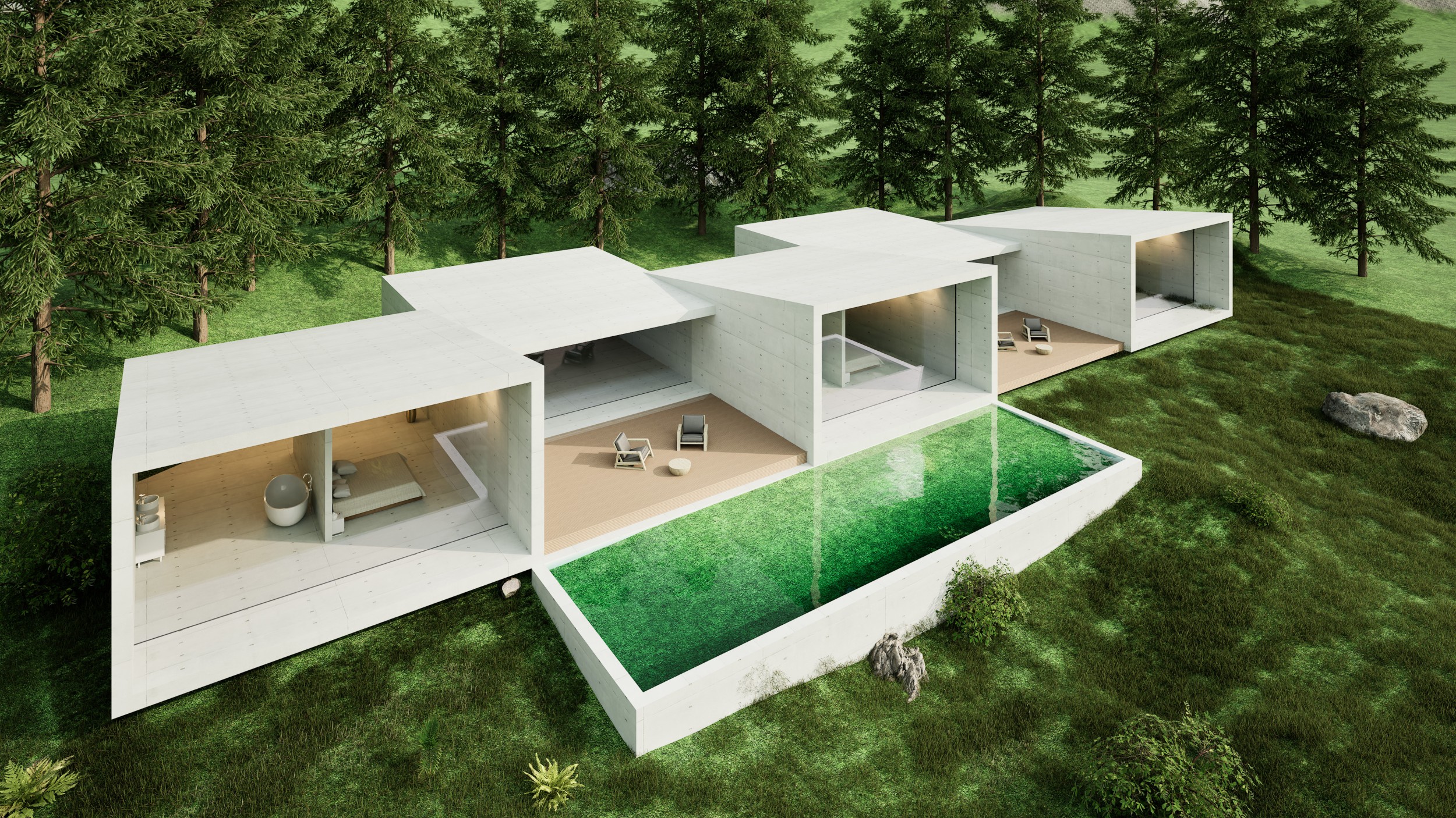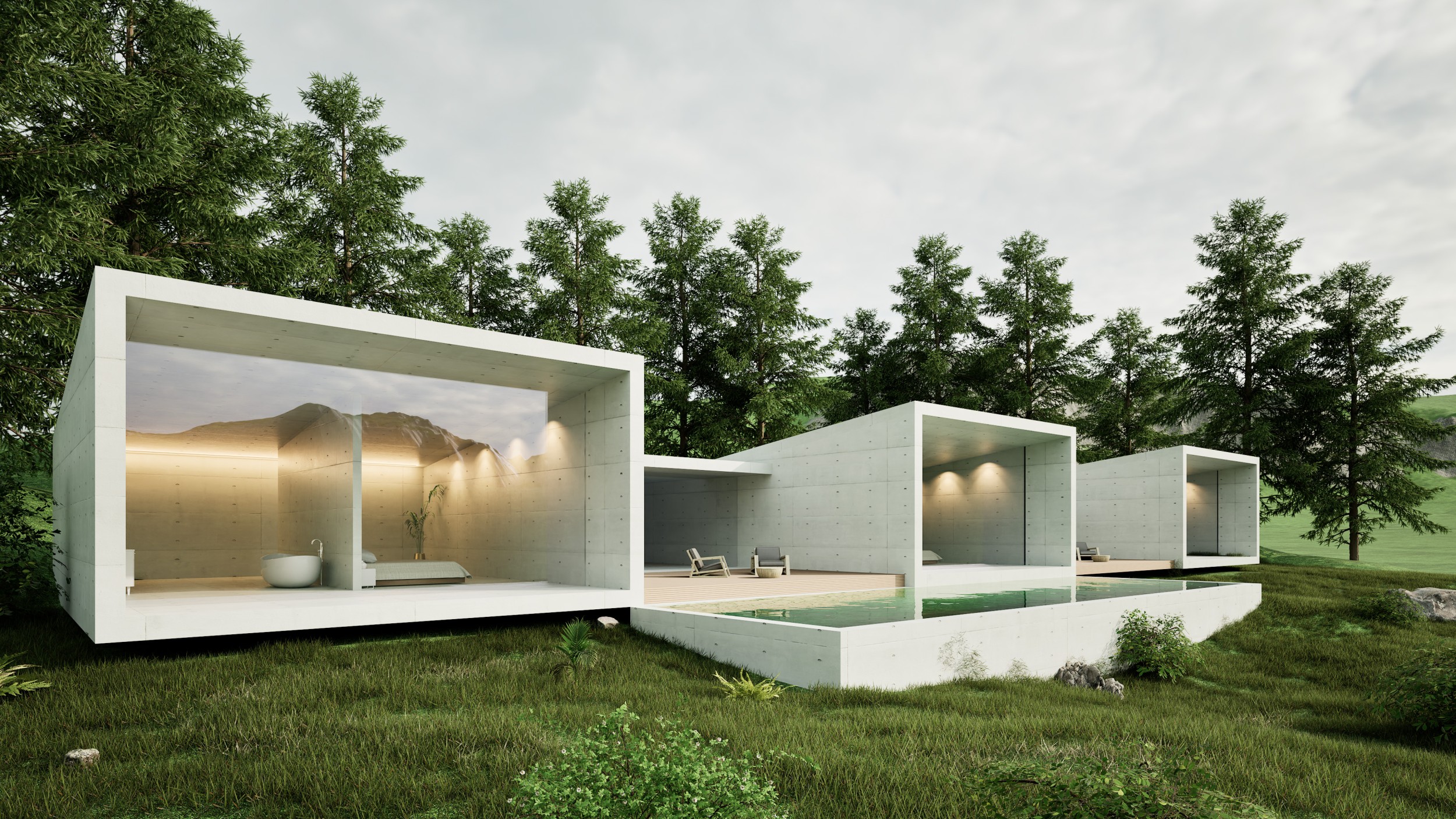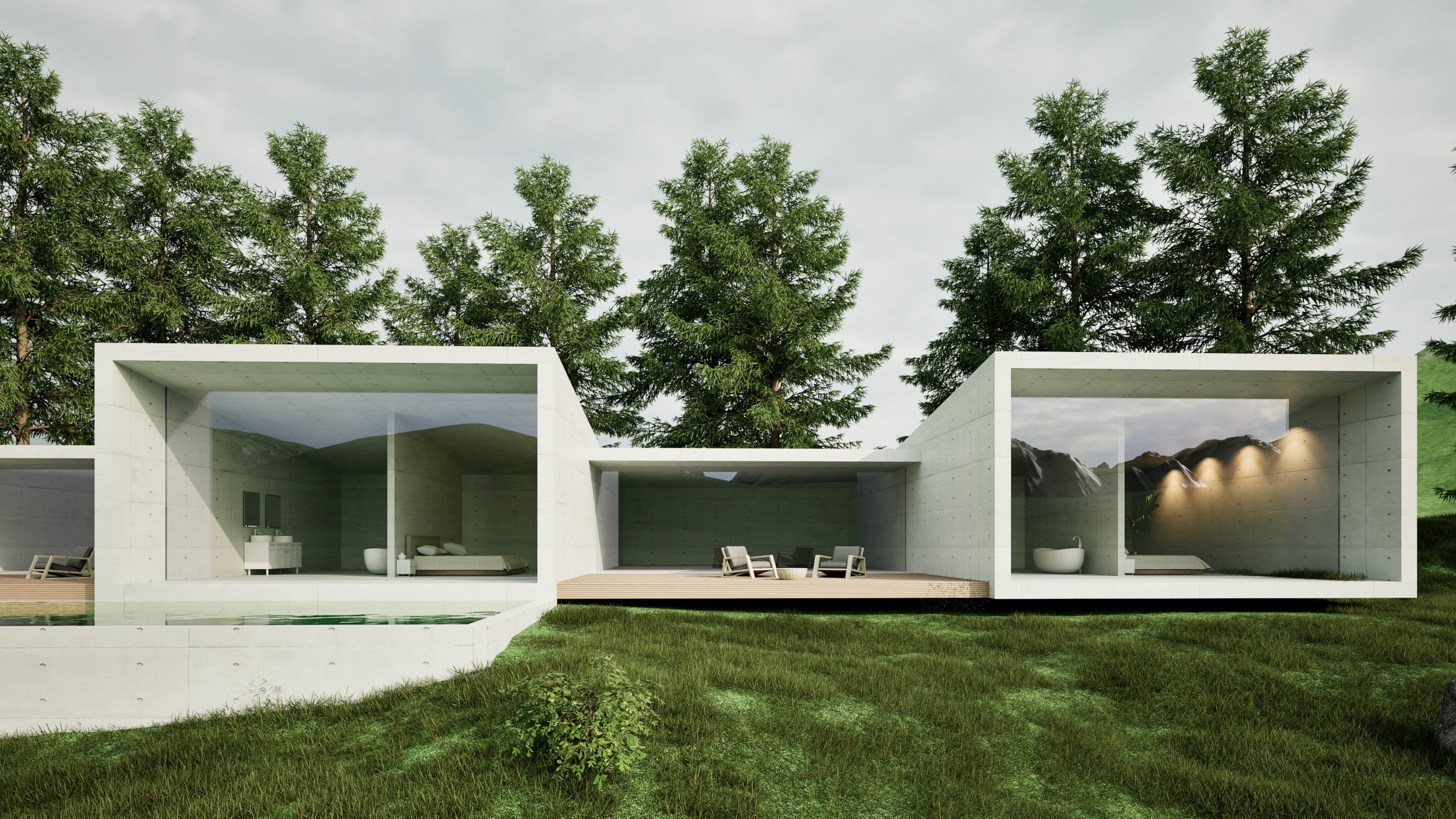 Für eine Familie in Labers wird der Abbruch und Wiederaufbau ihres in die Jahre gekommenen Wohnhauses geplant. Das Gebäude besticht durch drei Betonkörper die sich ins Tal öffnen. Dazwischen gibt es private Holzterrassen mit vorgelagertem Pool. Einen ruhigen Bereich für die Eltern. Ganz wichtig. Einen lauten Bereich für die Kinder. Ebenfalls wichtig. Zwei Materialien dominieren: Beton und Holz. Jeweils haptisch warm und zeitgemäß ausgeführt.