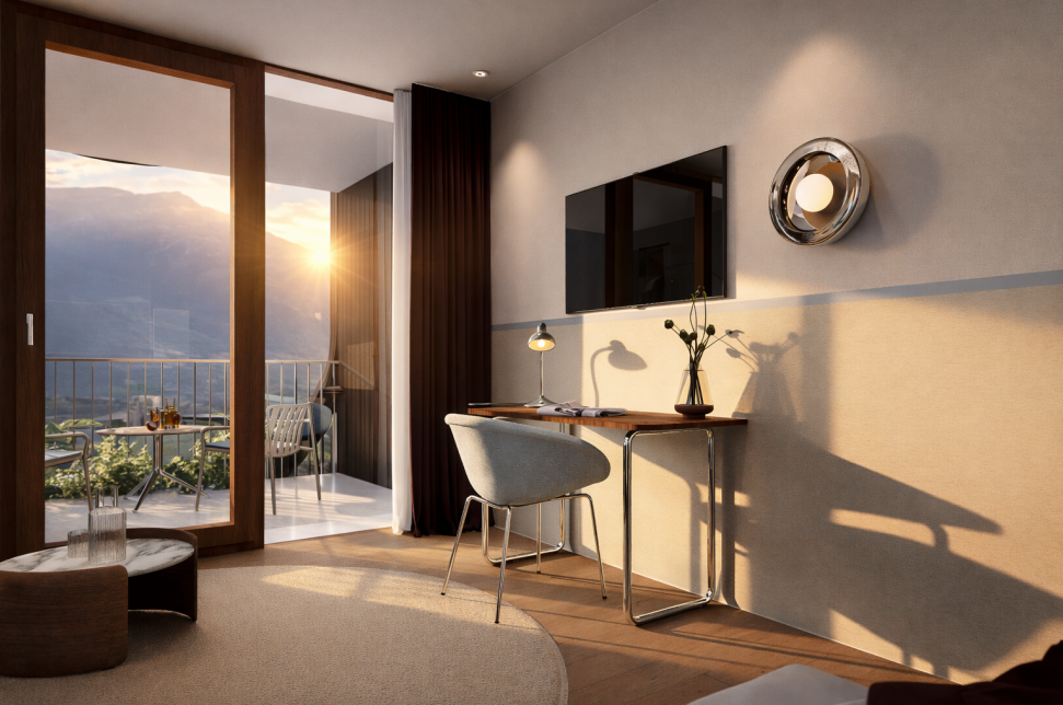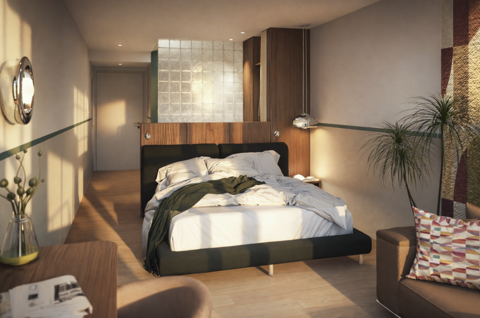 Die zukünftigen Zimmer der Pension zum Burggräfler vereinen klassische Retro-Elemente mit zeitgemäßer Gestaltung. Glasbausteine. Farbige Fliesen. Marmor. Chrome. Samtige Stoffe. All dies verschmilzt zu stilvollen Rückzugsorten. Voller Charakter. Voller Atmosphäre.