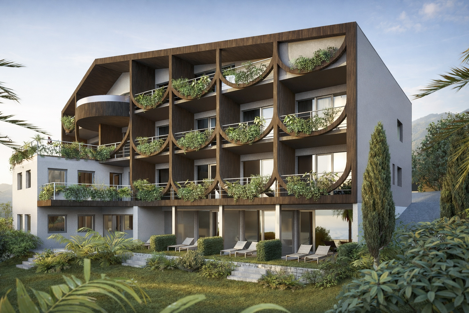 Eines unserer aktuellen Projekte: die Pension Zum Burggräfler in Schenna. Die neue Westfassade setzt ein kraftvolles architektonisches Statement. Hängende Rundbögen. Pflanzwannen. Üppiges Grün. Haus und Garten verschmelzen zu einer kleinen Oase. Ein absolutes Highlight: Der auskragende Whirlpool im Dachgeschoss mit Panoramablick. Bleibt gespannt auf das Endergebnis!