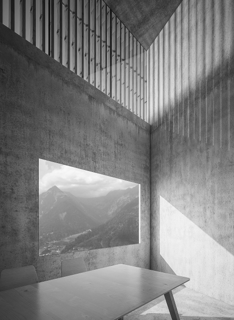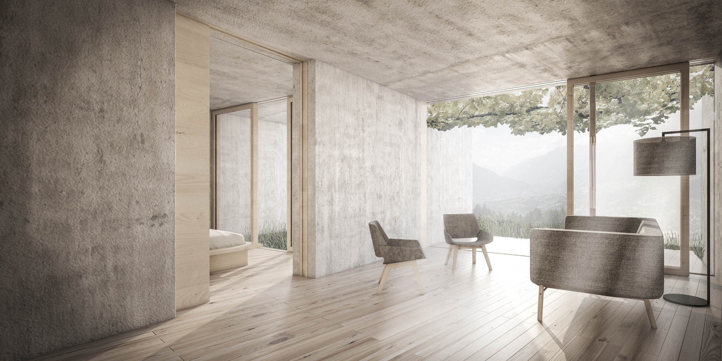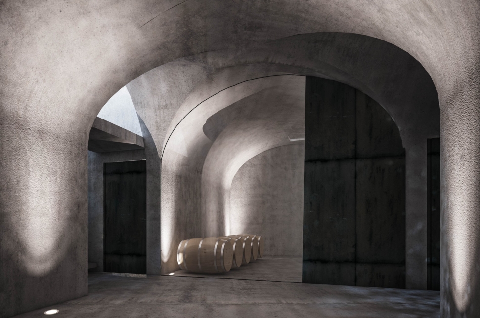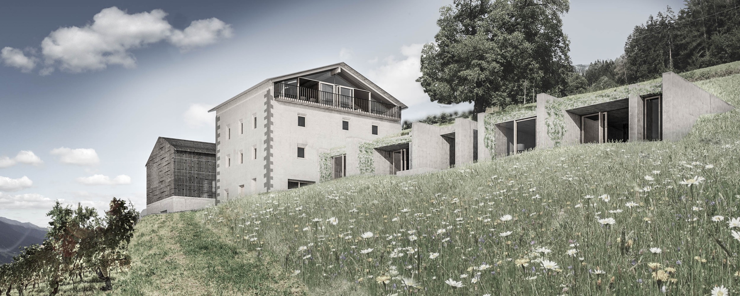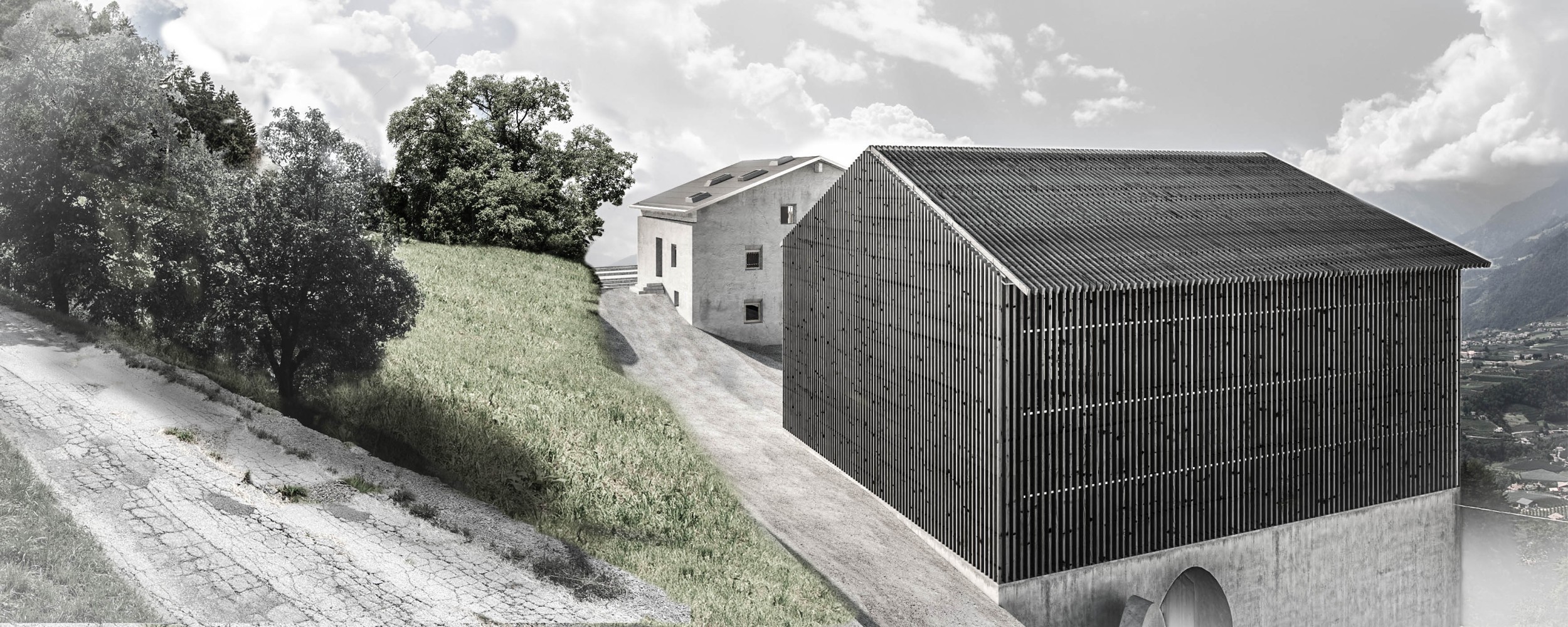 As the title suggests, this is the future vision for the Ausserrothhof. The farm building has already been renovated. Pressing the farm's own grapes in its own wine cellar is a dream. A concept was developed for the demolition and reconstruction of the barn. Below, a plinth made of exposed concrete with a cellar and tasting room. Only a window with a view of the vines lets in light. Above, a light-flooded storage area for machines and work. The barn 2.0.