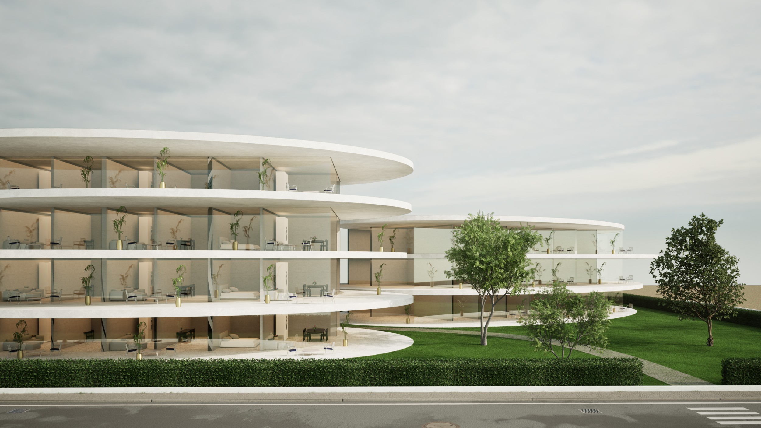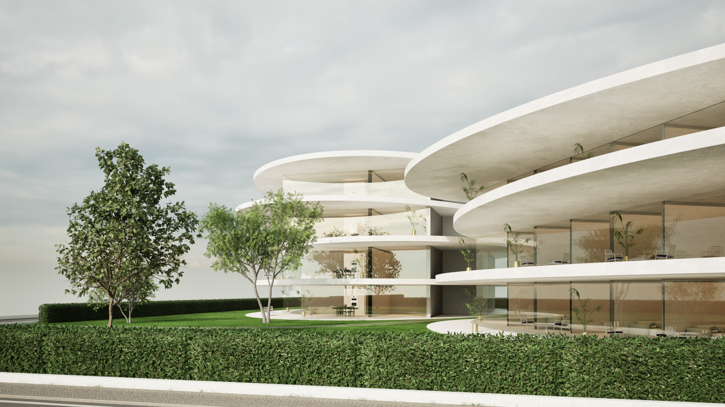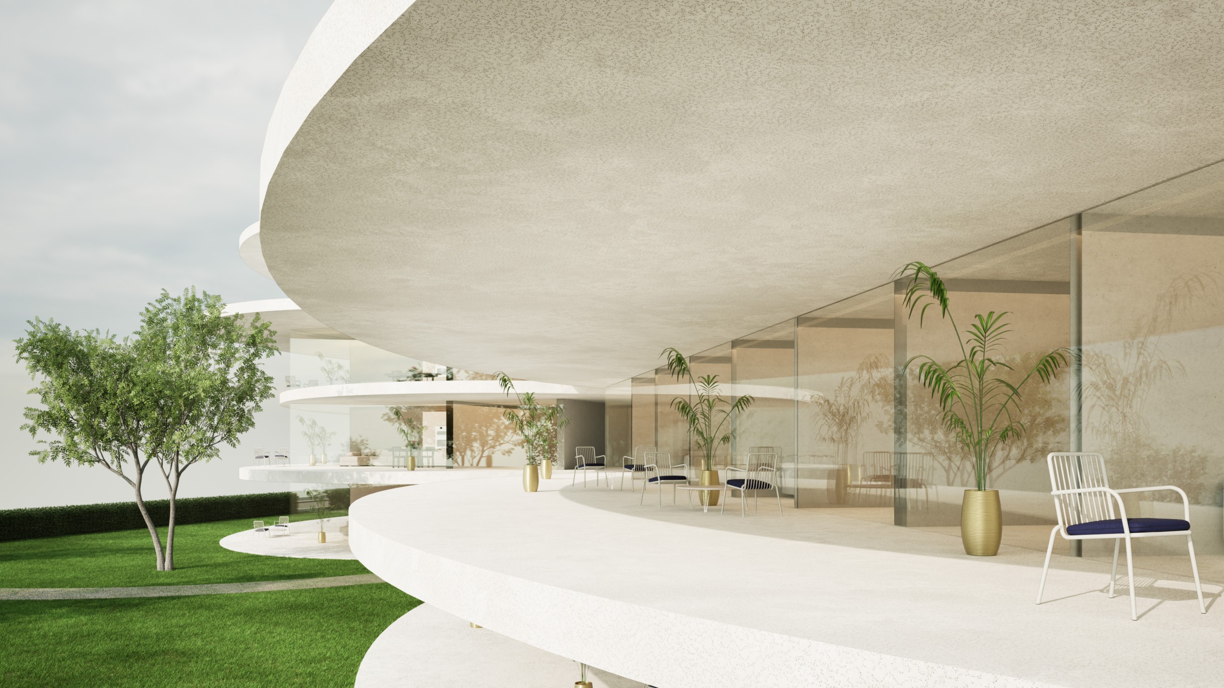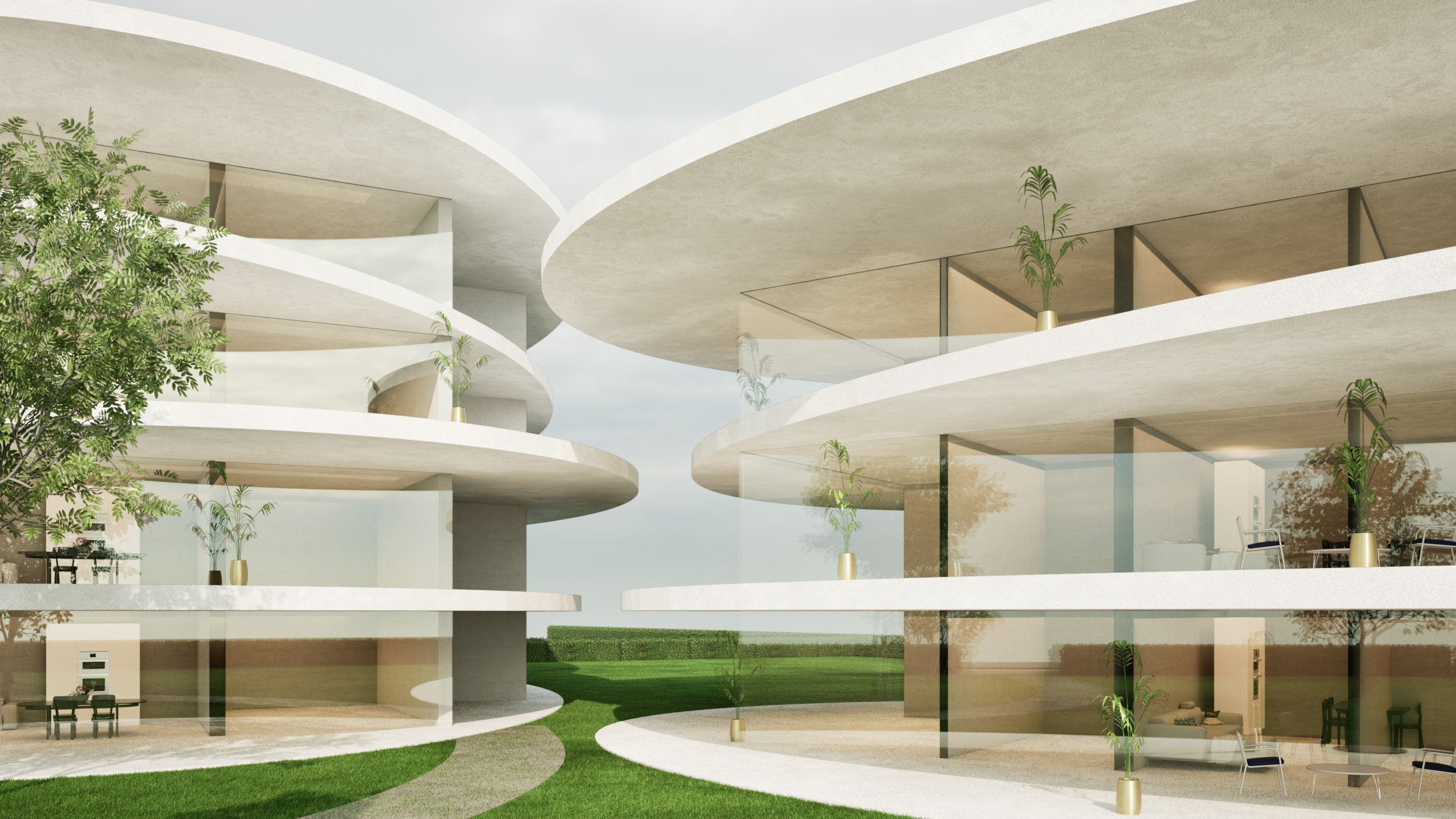 Fresbee is a preliminary study for a property developer for a development in Merano. Oval ceiling discs offset floor by floor are reminiscent of a landed UFO or Fresbee discs. This creates exterior and interior spaces with different heights, incidence of light, views and a sense of space. Glass and concrete with marble aggregates also create a luxurious character. The abundance of greenery symbolises the natural. The abundance of wood in the interior symbolises cosiness. Only for extraterrestrial customers 😉