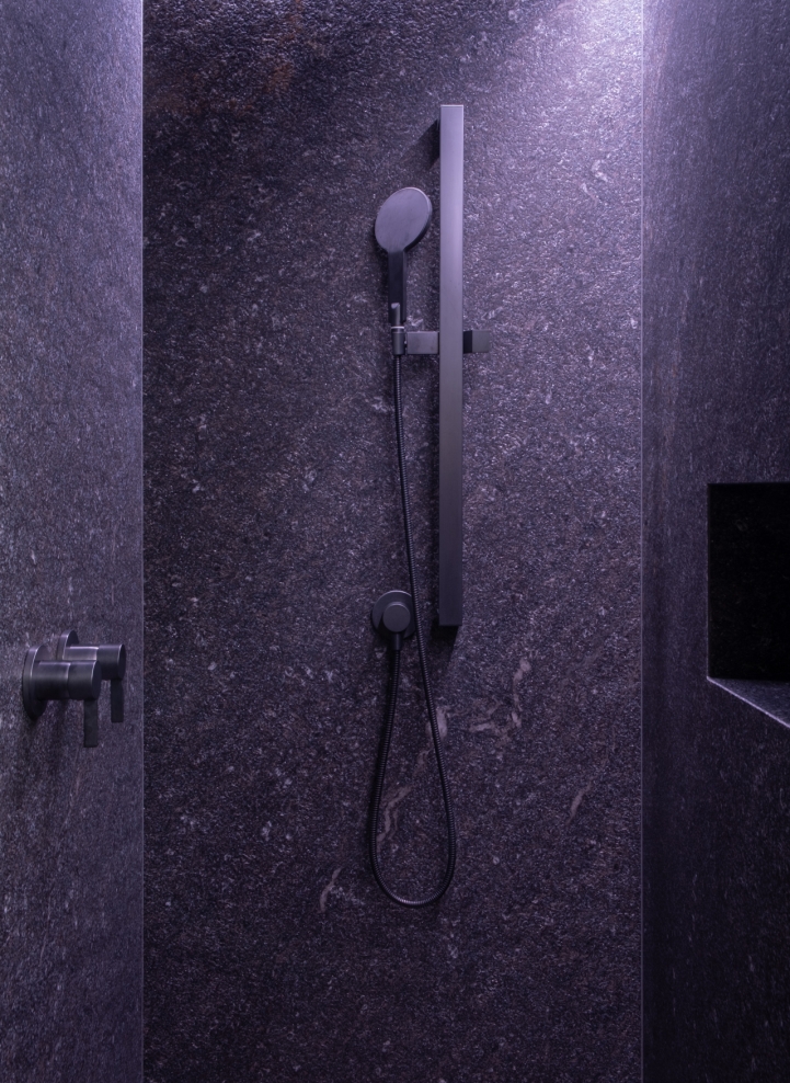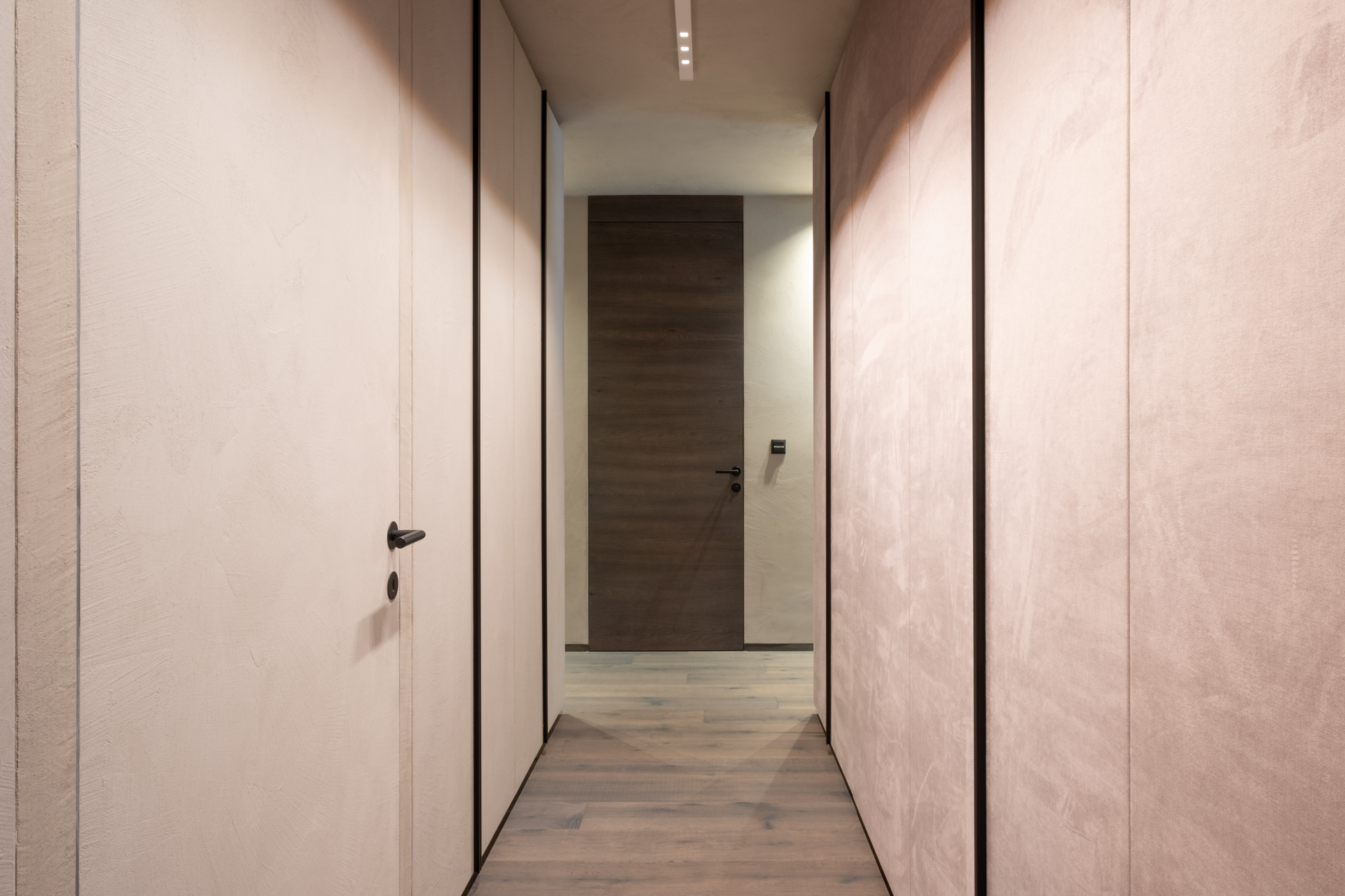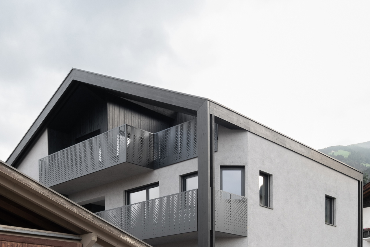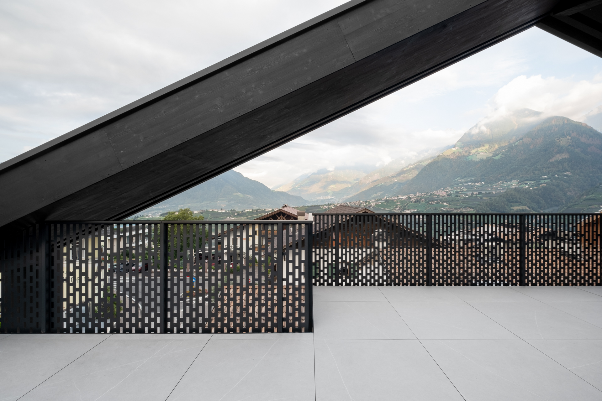 Residence for 2 families (parents + daughter) from Hotel Sunnwies. A shared roof terrace to relax on after work. Here we have carried out an energy-efficient refurbishment of an existing building. Depending on the sunshine, the hut sparkles with its unique airbrush plaster, black steel and wood dominate the exterior façades. Inside, we have chosen a clear and minimalist design with fine materials such as Smooth lime, natural stone, dark wood and wall panelling in fabric.