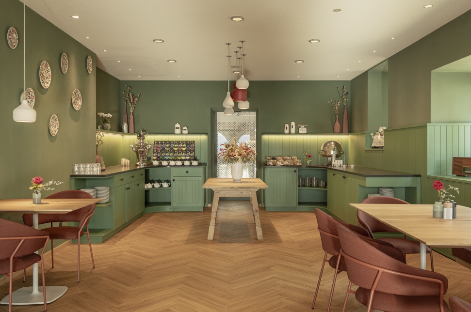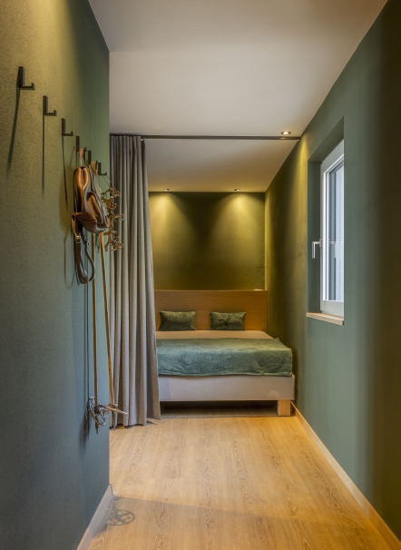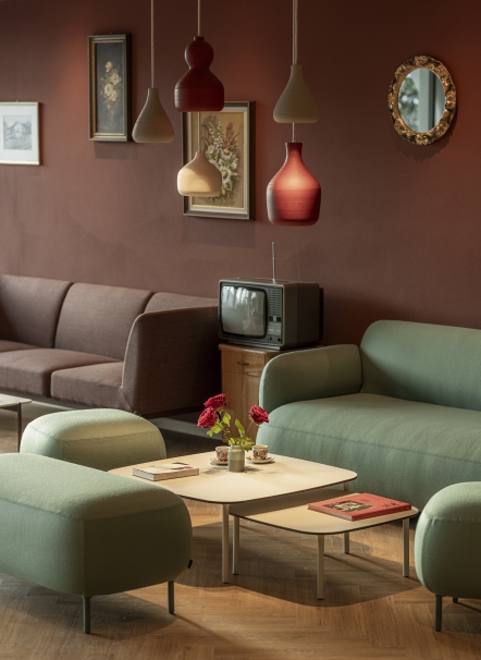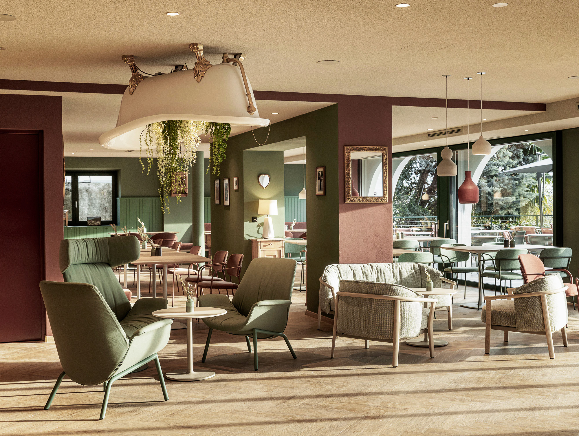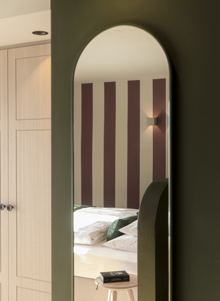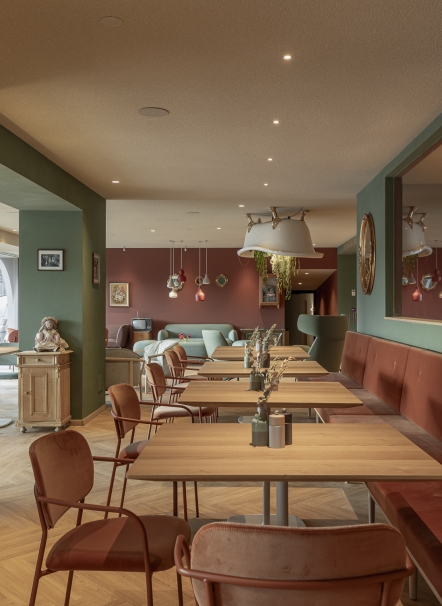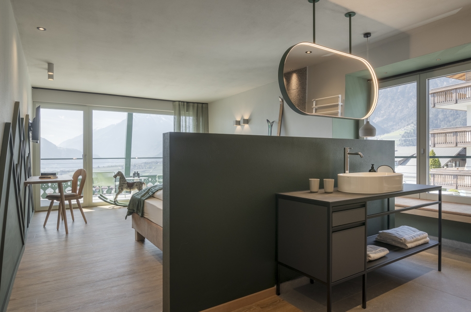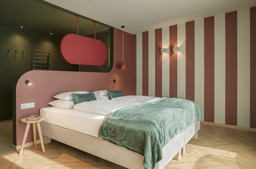 A Scena soffia un vento nuovo – Stephan e Rita hanno preso in mano la pensione Fernblick Höfler. Il nuovo Höfler affascina già all’esterno: la facciata riprende elementi tradizionali del paese – travi a vista, archi a tutto sesto, ringhiere in legno intagliato e pitture murali – reinterpretati in chiave contemporanea con decise tonalità di verde intenso e rosa antico. All'interno, lo stesso linguaggio stilistico audace continua: spazi aperti, passaggi fluidi tra bar, ristorante e reception, un mix di colori freschi, arredi moderni e oggetti vintage. La vasca da bagno sospesa? Un omaggio ironico all'alpinista Heini Holzer. E le camere? Tre temi, tre atmosfere – ognuna con la propria storia. Semplici nel design, ma piene di fascino e umore. Il nuovo Höfler non è una semplice ristrutturazione – ma l’espressione di un concetto vissuto in modo coerente fin dall’inizio.