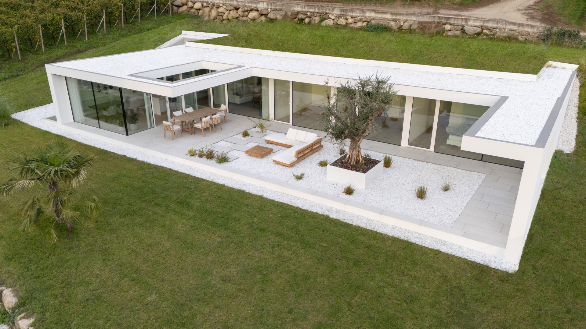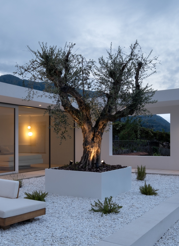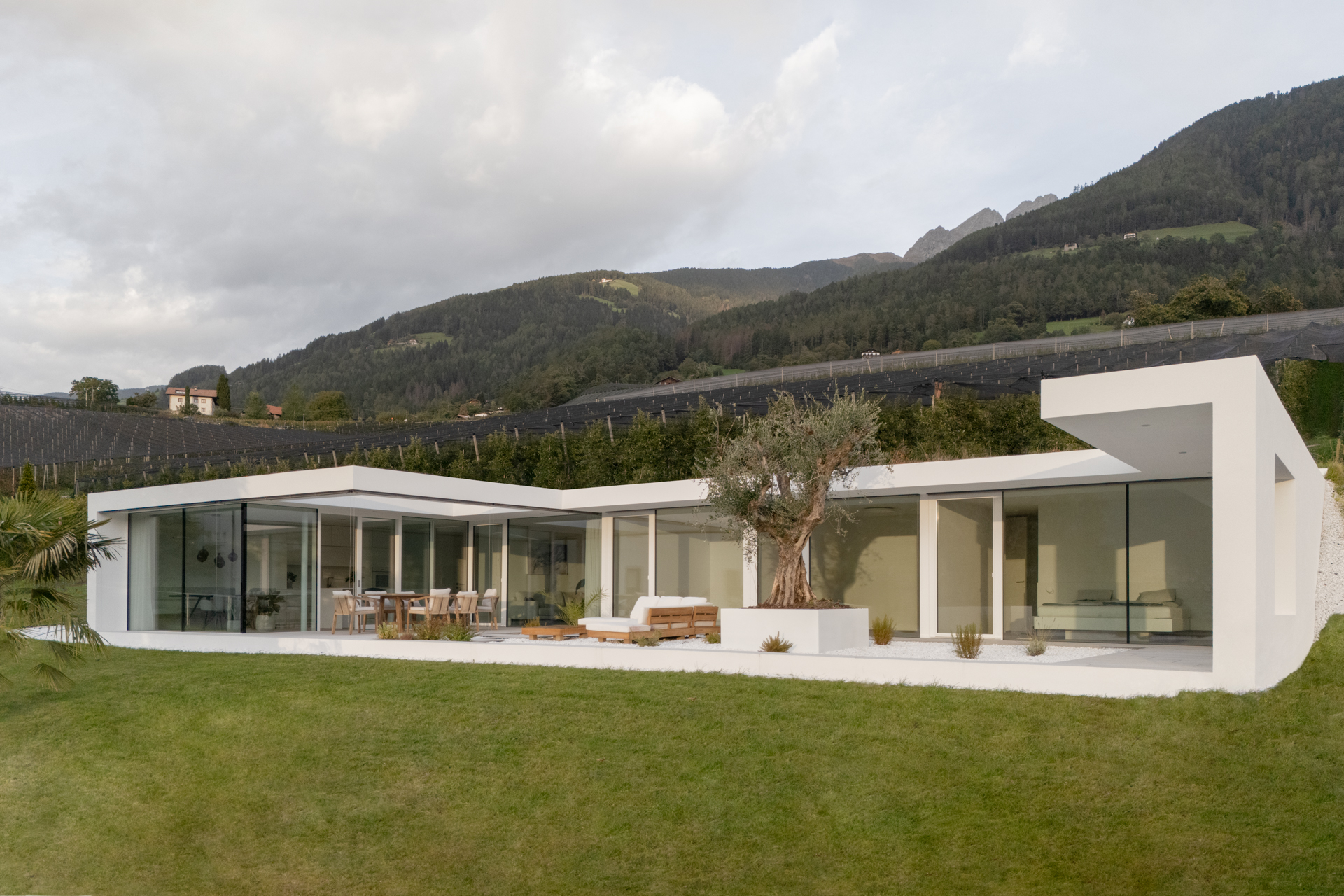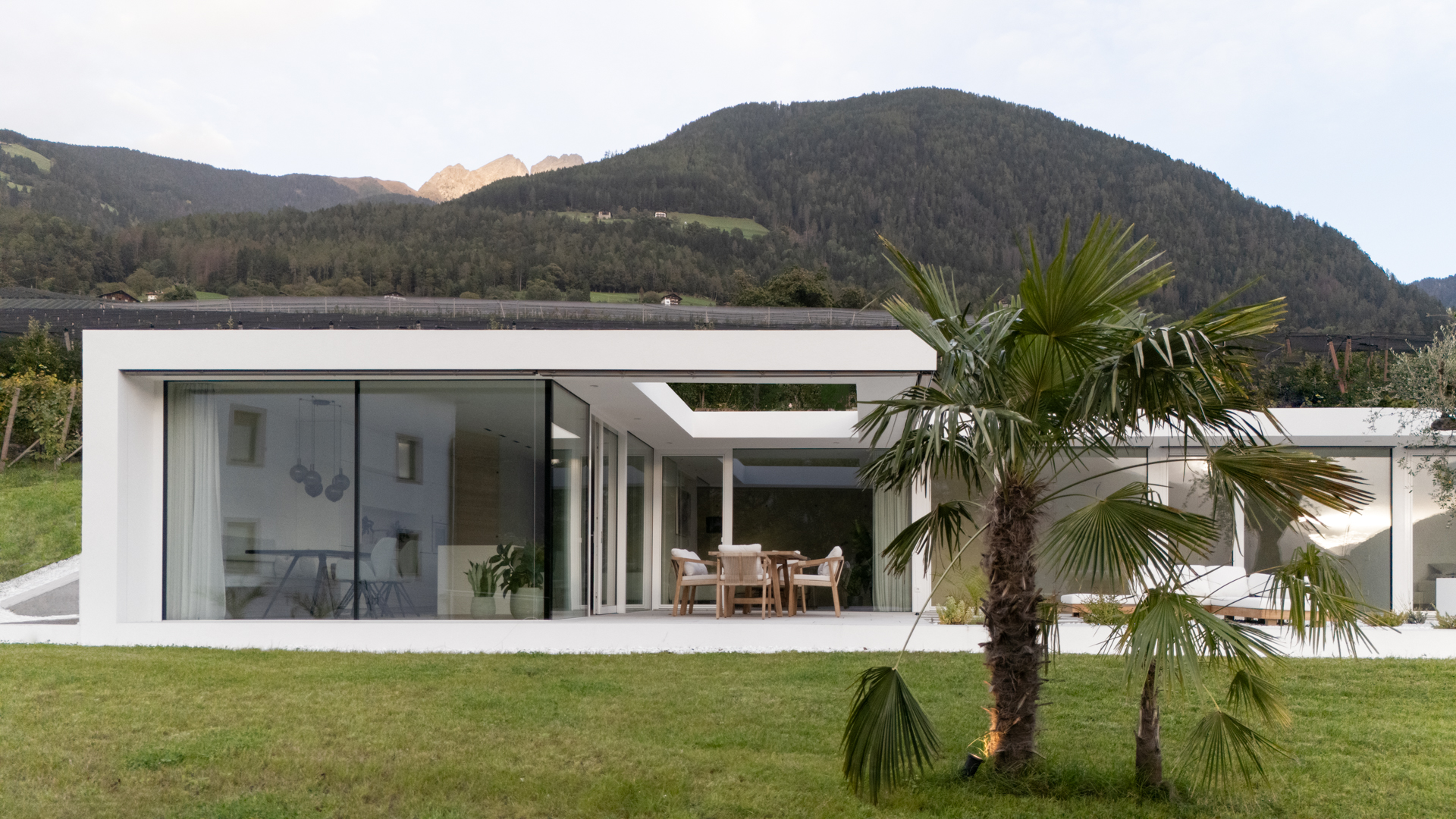 Una casa vacanza da abitare tutti i giorni. Dal design chiaro e un'architettura minimalista in interno e all'esterno. L'intero spazio abitativo si estende su un unico piano, integrato nel paesaggio circostante. Le vetrate a tutta superficie e senza telaio assicurano una transizione diretta tra il ‘dentro’ e il ‘fuori’. L'intonaco bianco, il cemento a vista di colore chiaro, il legno, il verde e le piante creano un ambiente alpino-mediterraneo che si adatta perfettamente a Scena.