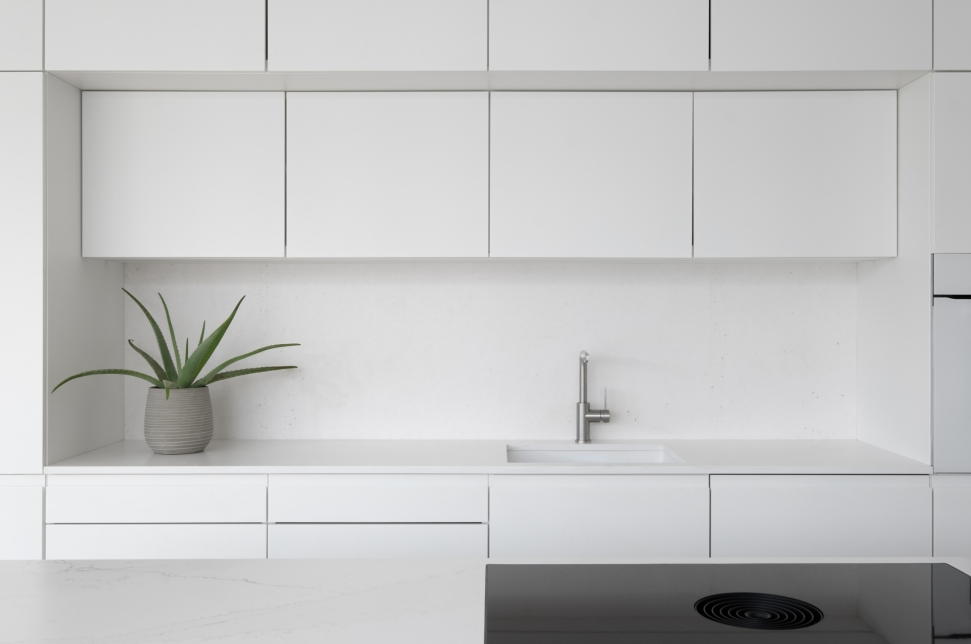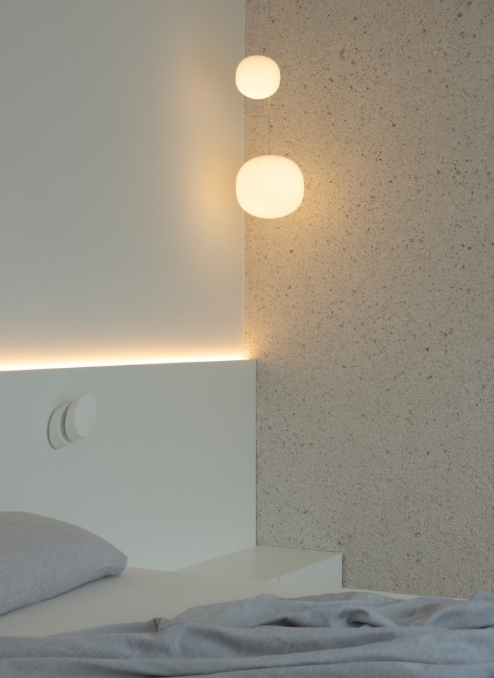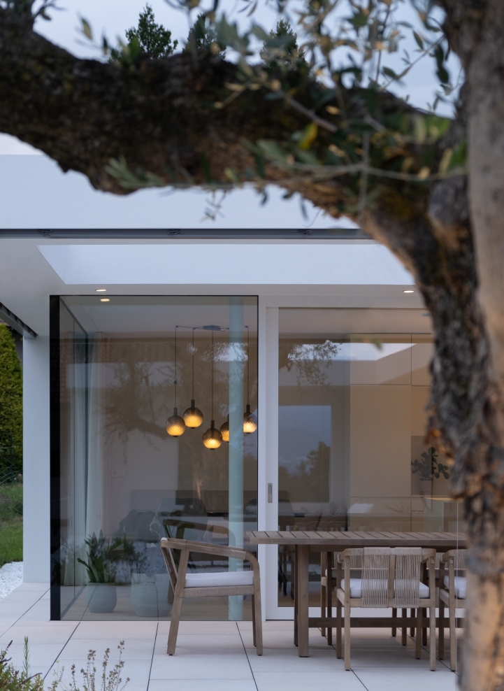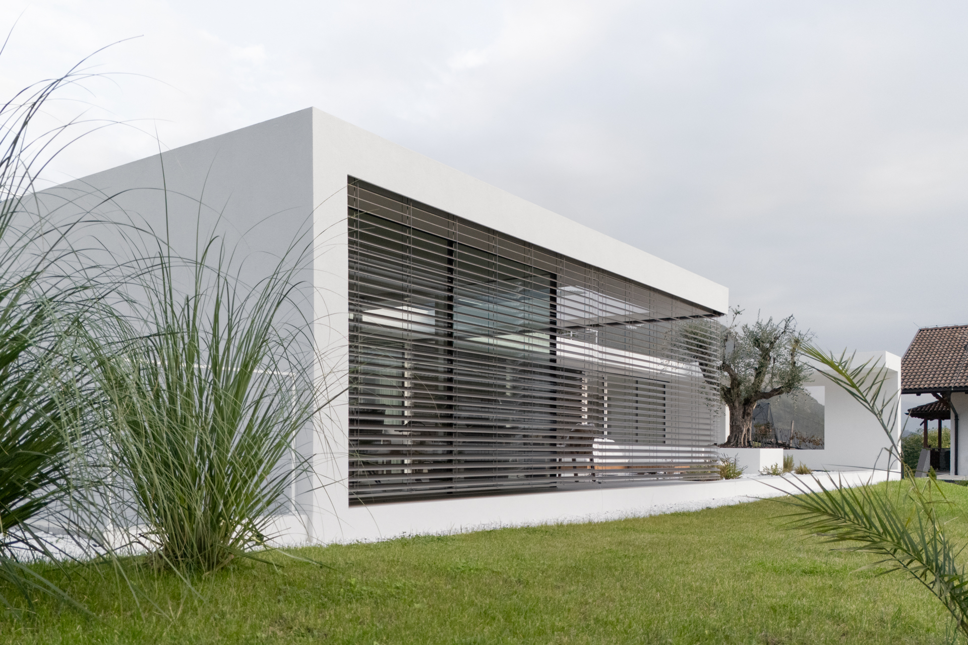 Una casa vacanza da abitare tutti i giorni. Dal design chiaro e un'architettura minimalista in interno e all'esterno. L'intero spazio abitativo si estende su un unico piano, integrato nel paesaggio circostante. Le vetrate a tutta superficie e senza telaio assicurano una transizione diretta tra il ‘dentro’ e il ‘fuori’. L'intonaco bianco, il cemento a vista di colore chiaro, il legno, il verde e le piante creano un ambiente alpino-mediterraneo che si adatta perfettamente a Scena.